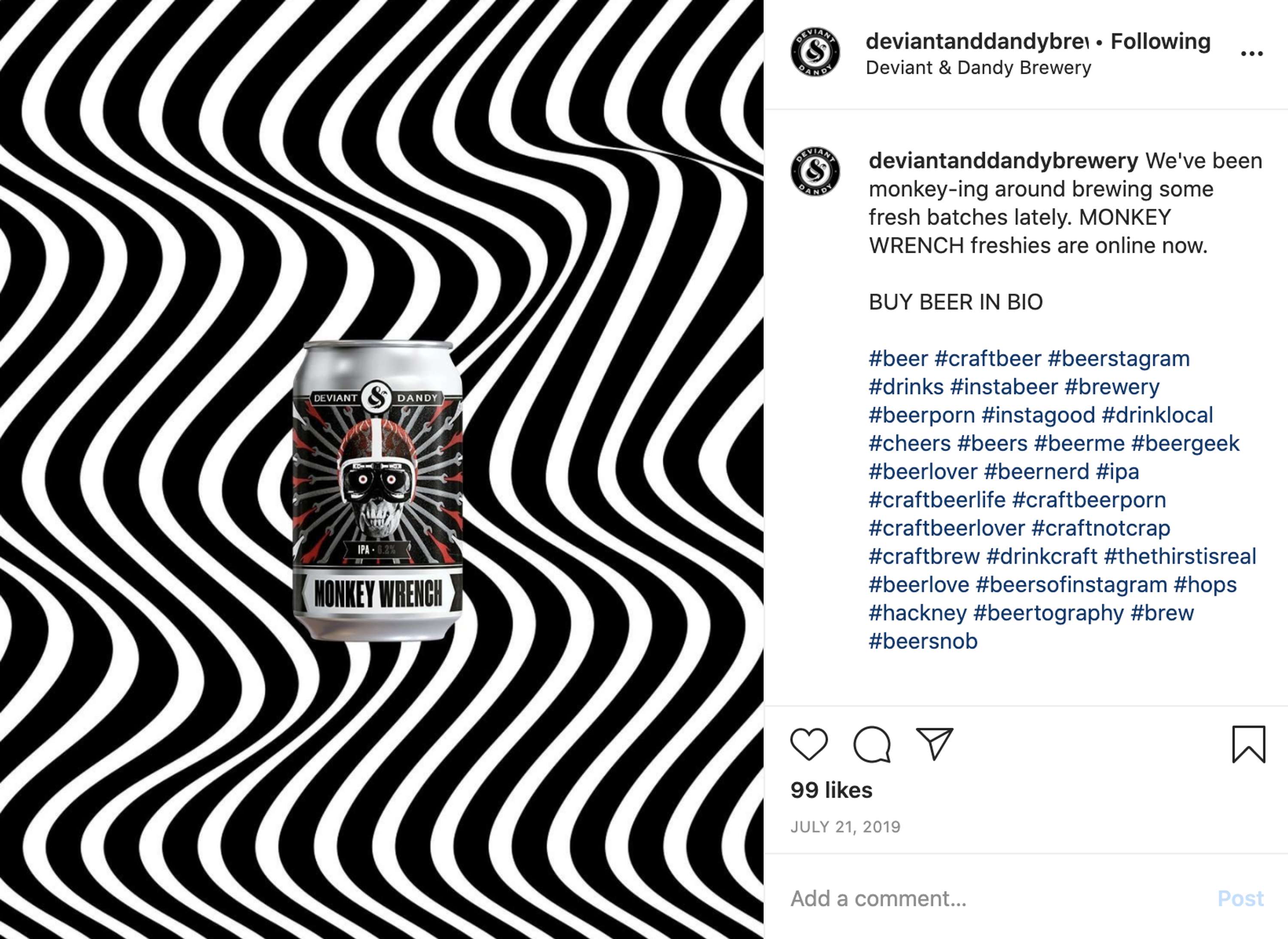 I partnered with East London craft brewery Deviant & Dandy to create a series of Instagram product graphics designed specifically to interrupt scroll behaviour. Working within a lean budget, we developed custom optical illusion assets that activated through the natural motion of thumb-scrolling, making the artwork appear to move directly within the feed. The concept aligned with the brand’s playful tone and hero product range, combining smart visual craft with sharp, on-brand copy to create thumb-stopping content that felt native to Instagram rather than adapted for it.